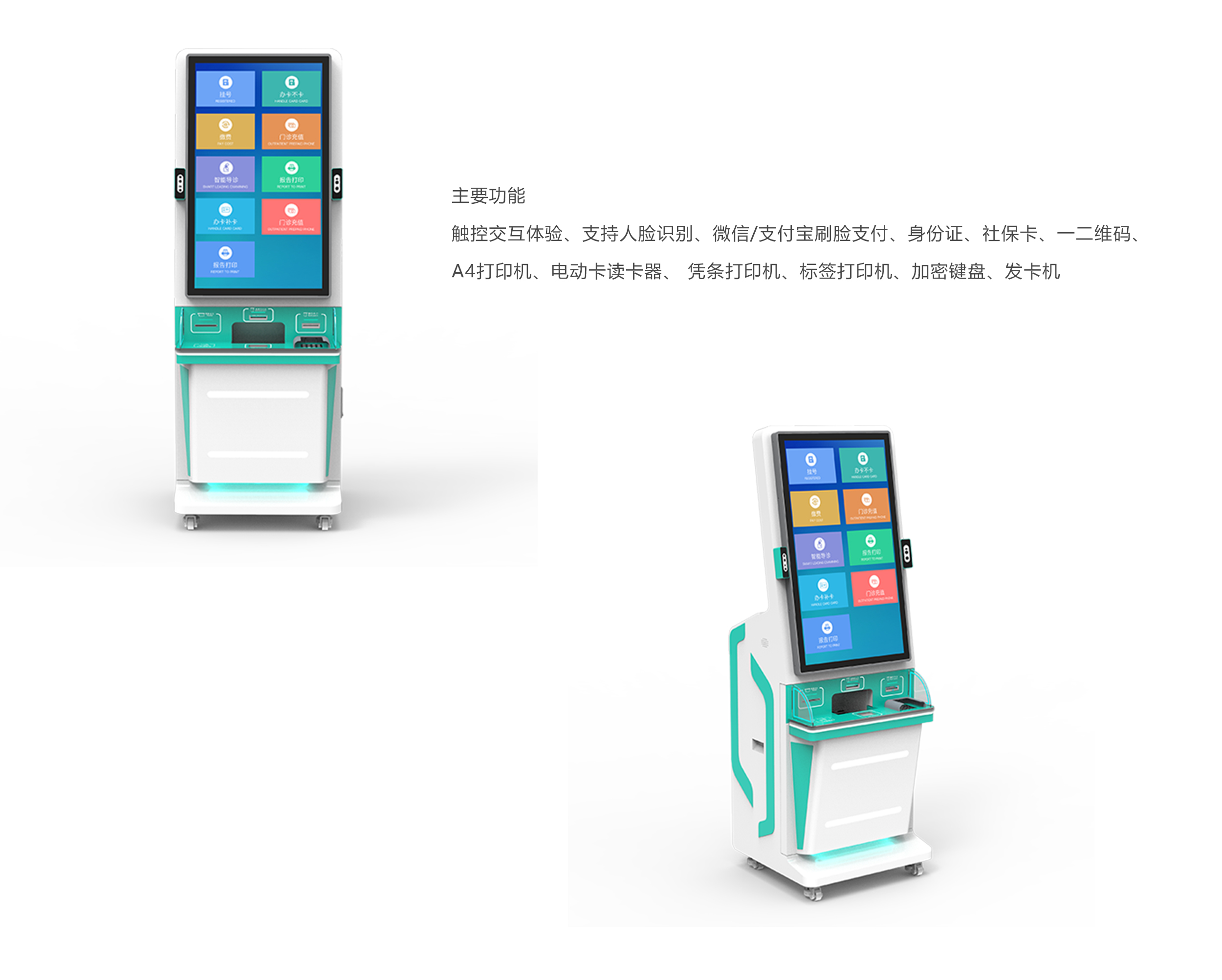 醫(yī)療自助服務(wù)終端可集成身份證讀卡器、社??ㄗx卡器、電子社??⊕叽a、RFID圖書(shū)讀卡器等,患者自助掛號(hào)、查詢、打印、繳費(fèi)等諸多功能。